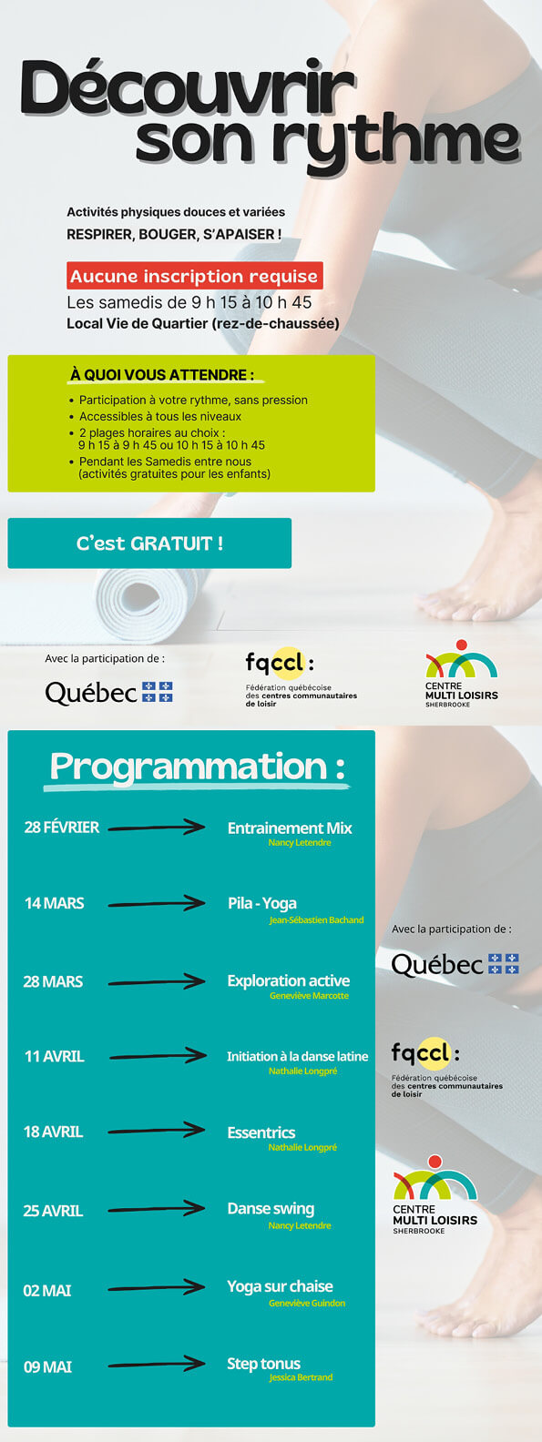 Une programmation d’activités physiques douces et variées vous attend au Local Vie de Quartier (Kabak).